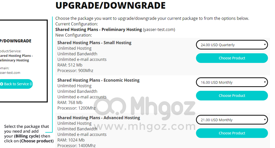 3. Compare the available upgrade/downgrade options and choose the prefered plan then click on “Choose Product” and you will be redirected to payment step as you see in the following screenshot: